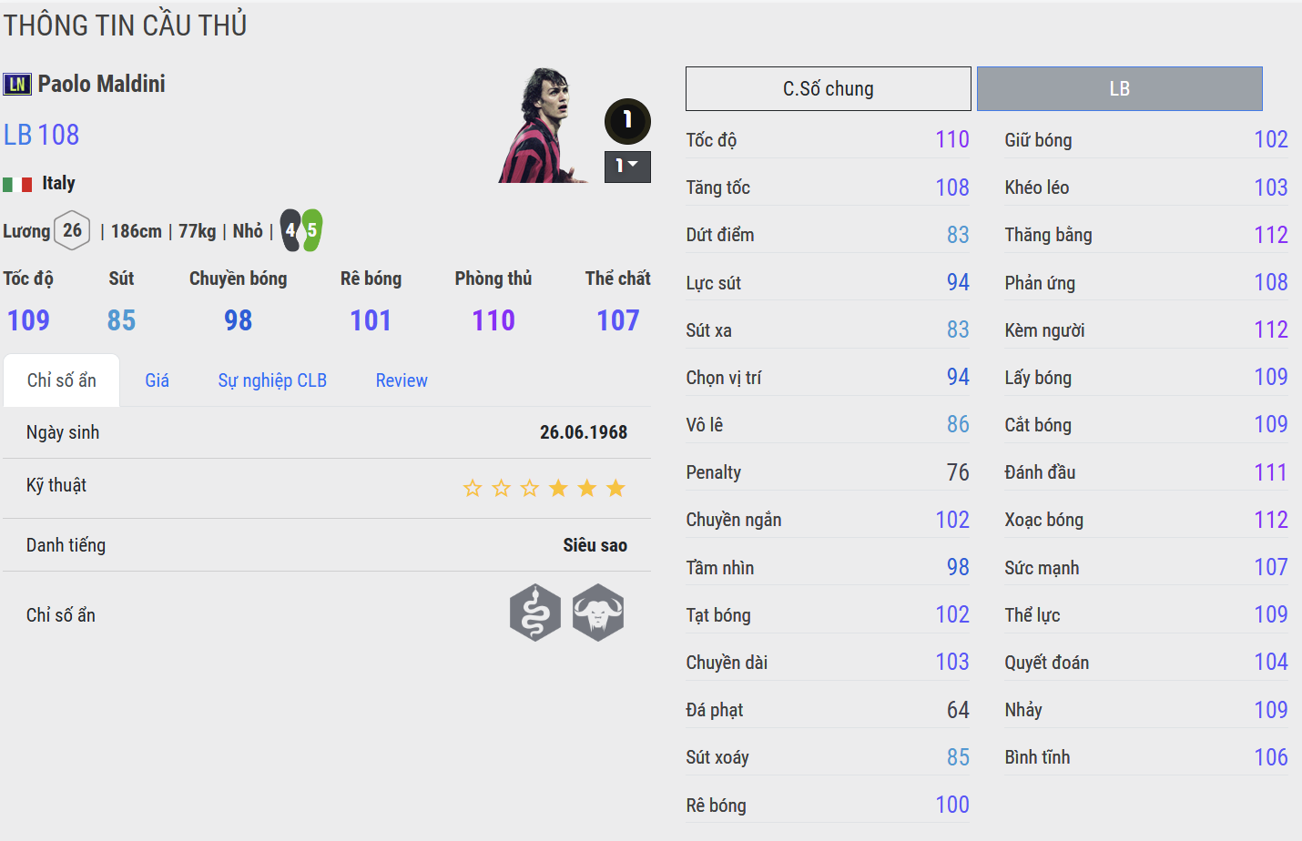 Không có gì ngạc nhiên khi Maldini xuất hiện trong danh sách này. Huyền thoại người Ý sở hữu AI phòng ngự cực tốt, khả năng đọc tình huống tuyệt vời và tốc độ đáng nể. Dù chơi ở vị trí trung vệ hay hậu vệ cánh, Maldini vẫn là một bức tường vững chắc trước khung thành.