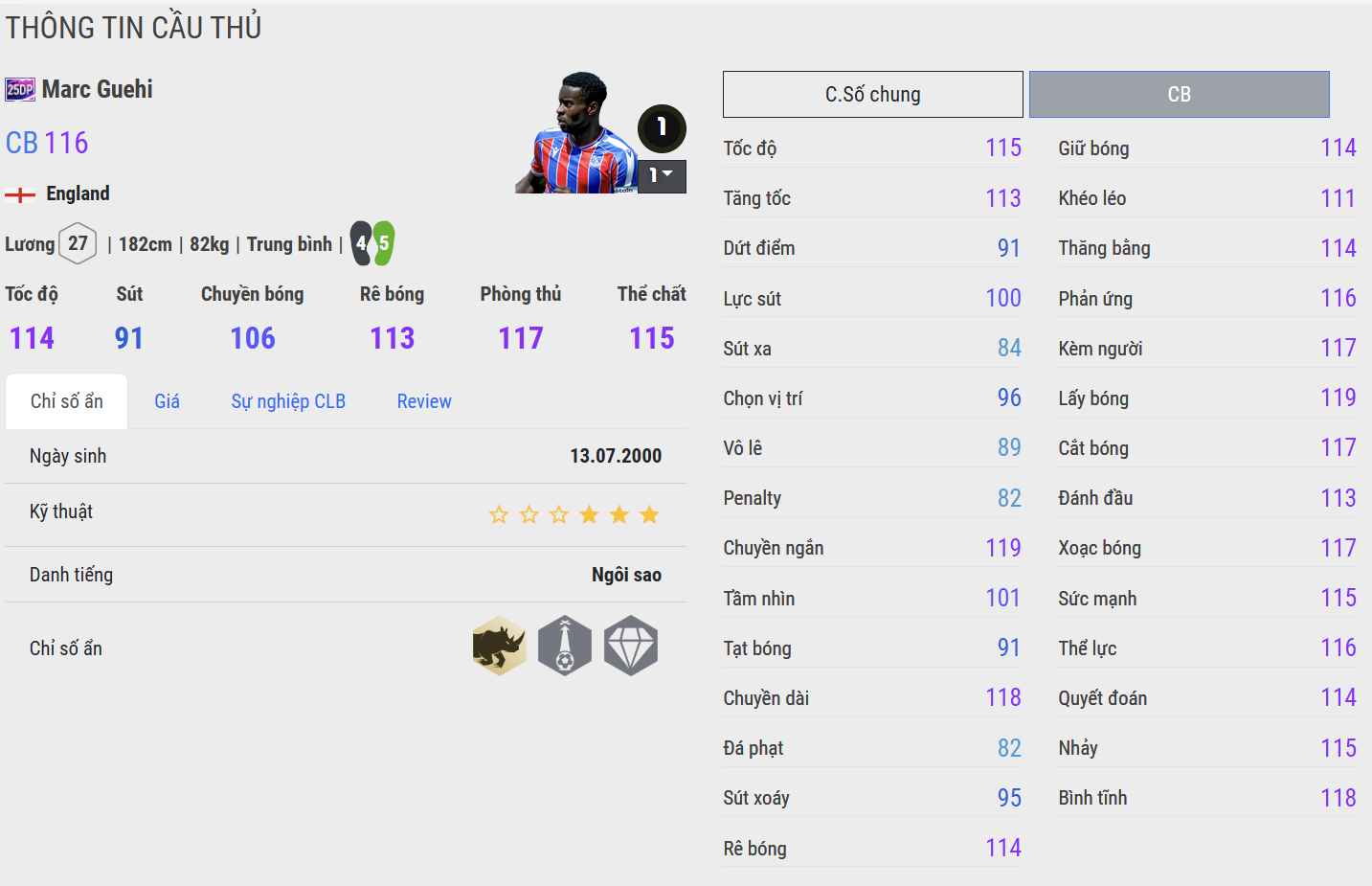 Guéhi là mẫu trung vệ hiện đại – mạnh mẽ, quyết liệt nhưng vẫn giữ được sự điềm tĩnh. Điểm mạnh của anh nằm ở khả năng tì đè và phản ứng nhanh trong các pha đối đầu 1v1. Không chiến ổn định, bọc lót tốt và đặc biệt hiệu quả khi đá trong hệ thống pressing. Guéhi 25DP đem lại cảm giác tin cậy cho hàng thủ, là lựa chọn lý tưởng cho người thích phong cách phòng ngự chủ động.