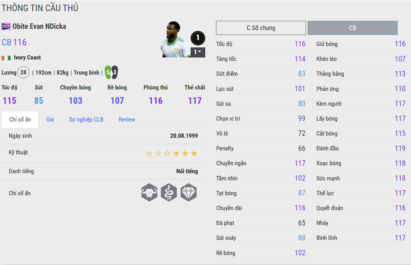 Ndicka nổi bật với thể hình ấn tượng và lối chơi giàu sức mạnh. Trung vệ người Pháp này không chỉ phòng ngự chắc chắn mà còn tham gia tấn công hiệu quả trong các pha cố định nhờ khả năng bật nhảy và dứt điểm bằng đầu tốt. Anh xử lý bóng tương đối gọn gàng, ít mắc sai lầm, phù hợp với lối đá kỷ luật, thiên về kiểm soát thế trận. Một cái tên đáng giá cho mọi hàng thủ thiên hướng thể lực.