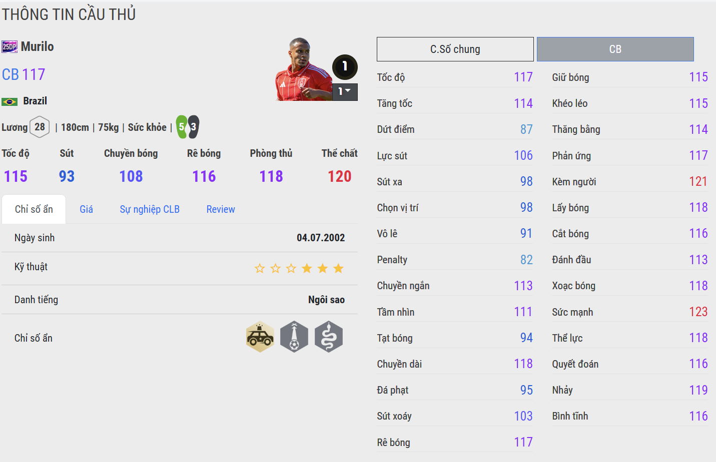 Murilo là hình mẫu của một “chiến binh thép”. Lối chơi máu lửa, mạnh mẽ trong tranh chấp và luôn sẵn sàng xả thân để bảo vệ khung thành. Anh có khả năng cắt bóng và xoạc bóng cực kỳ chuẩn xác, đồng thời sở hữu AI phòng ngự cao, luôn biết khi nào cần dâng lên hoặc lùi về. Murilo 25DP mang đến sự chắc chắn và ổn định đáng kinh ngạc – lựa chọn hàng đầu cho lối chơi phòng ngự phản công.
