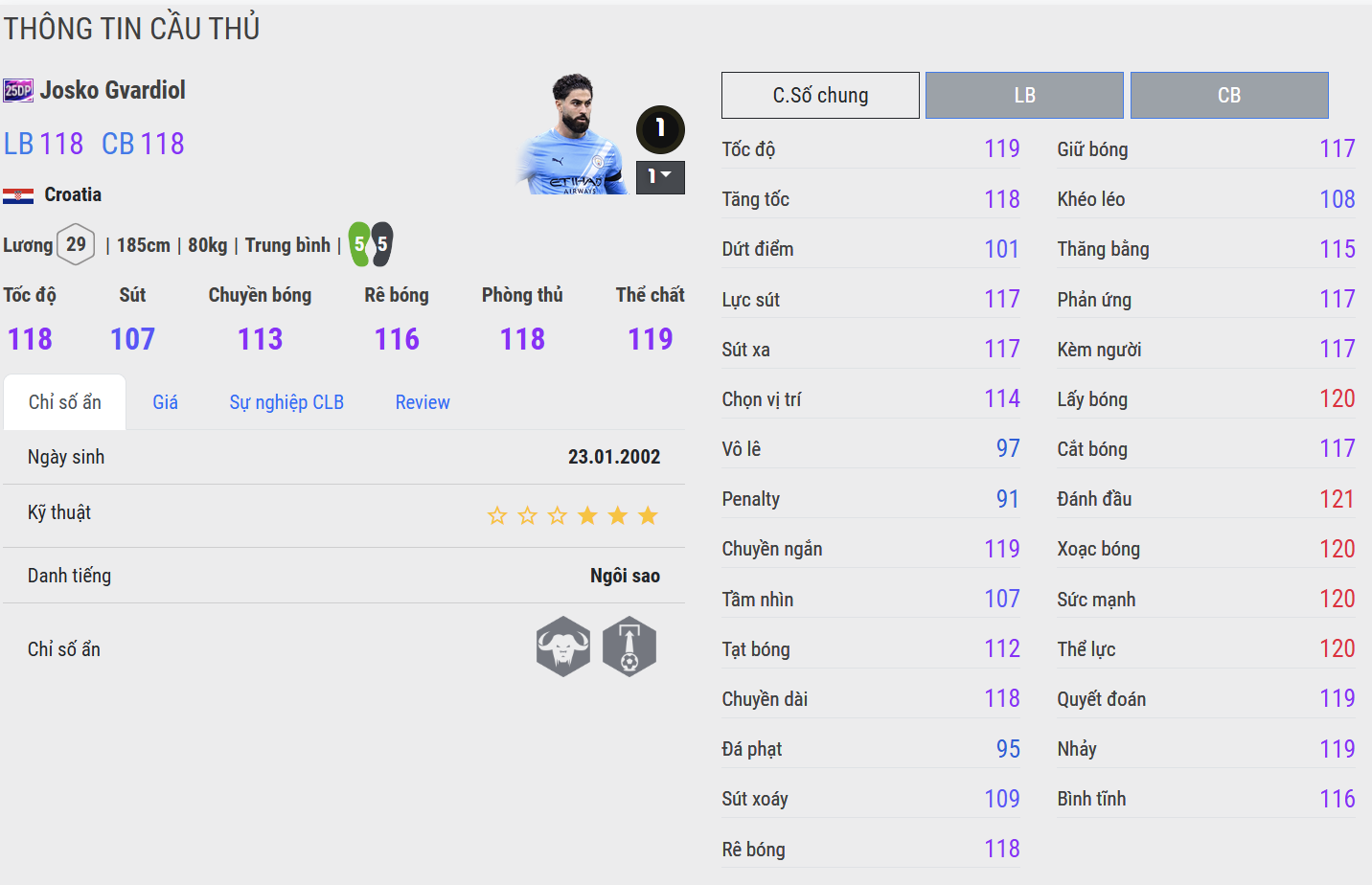Đứng đầu bảng xếp hạng, Gvardiol là biểu tượng hoàn hảo của một trung vệ toàn diện. Anh hội tụ mọi phẩm chất cần có: tốc độ, sức mạnh, khả năng đọc tình huống và chơi chân cực tốt. Trong 25DP, Gvardiol thể hiện sự trưởng thành vượt bậc – ra quyết định nhanh, giữ vị trí thông minh và chuyền bóng mở ra cơ hội tấn công. Là thủ lĩnh thực thụ nơi hàng phòng ngự, anh chính là “trái tim thép” của mùa thẻ này.