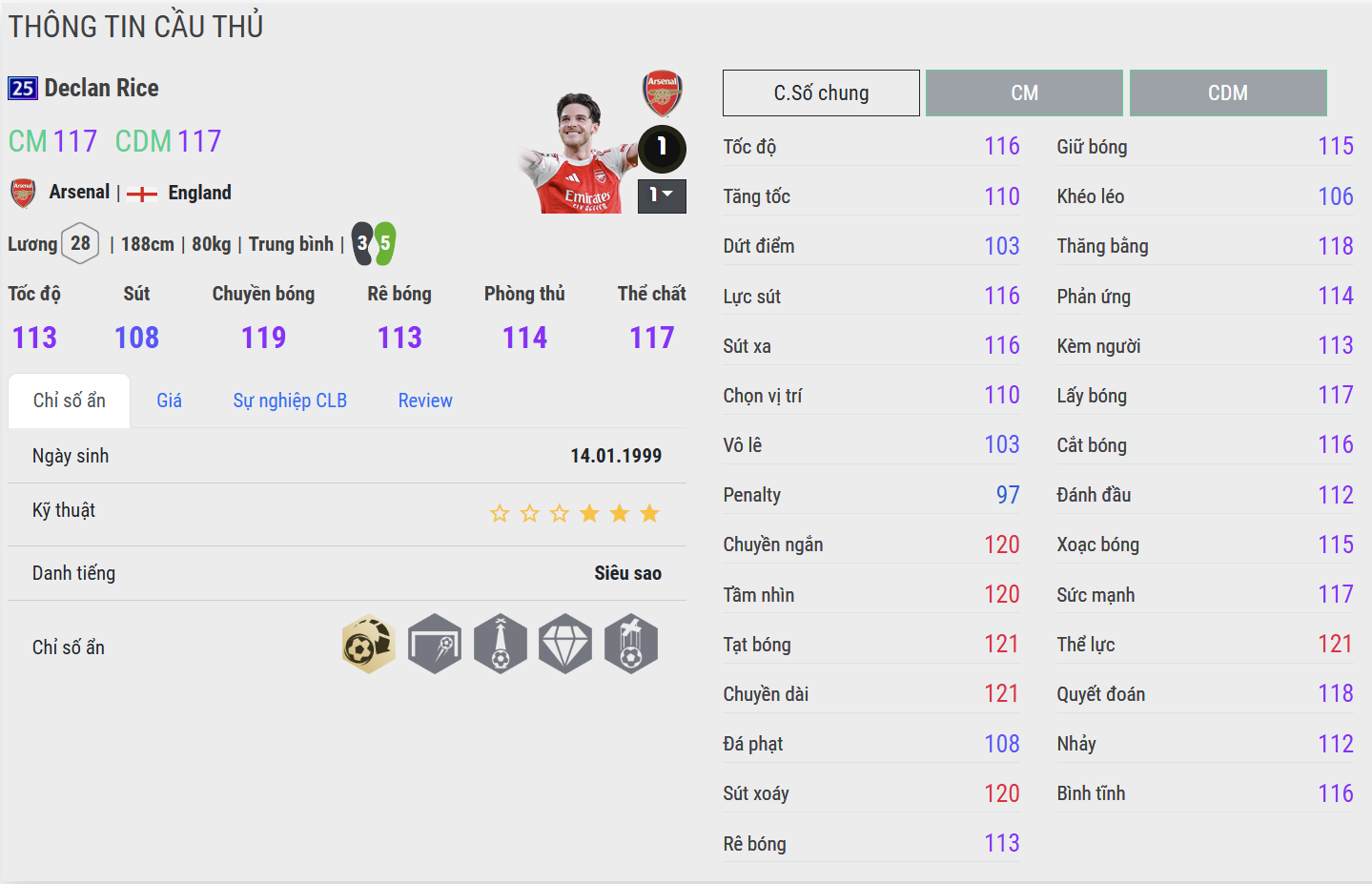 Declan Rice 25UCL là phiên bản toàn diện nhất trong nhóm. Vừa mạnh trong phòng ngự, vừa đủ kỹ năng chuyền bóng để triển khai tấn công. Khả năng che chắn trước hàng thủ rất ổn định, tranh chấp tay đôi tốt và giữ vị trí thông minh. Rice mang lại sự cân bằng hoàn hảo giữa phòng ngự và điều tiết, phù hợp đá CDM hoặc CM lùi trong nhiều sơ đồ khác nhau.