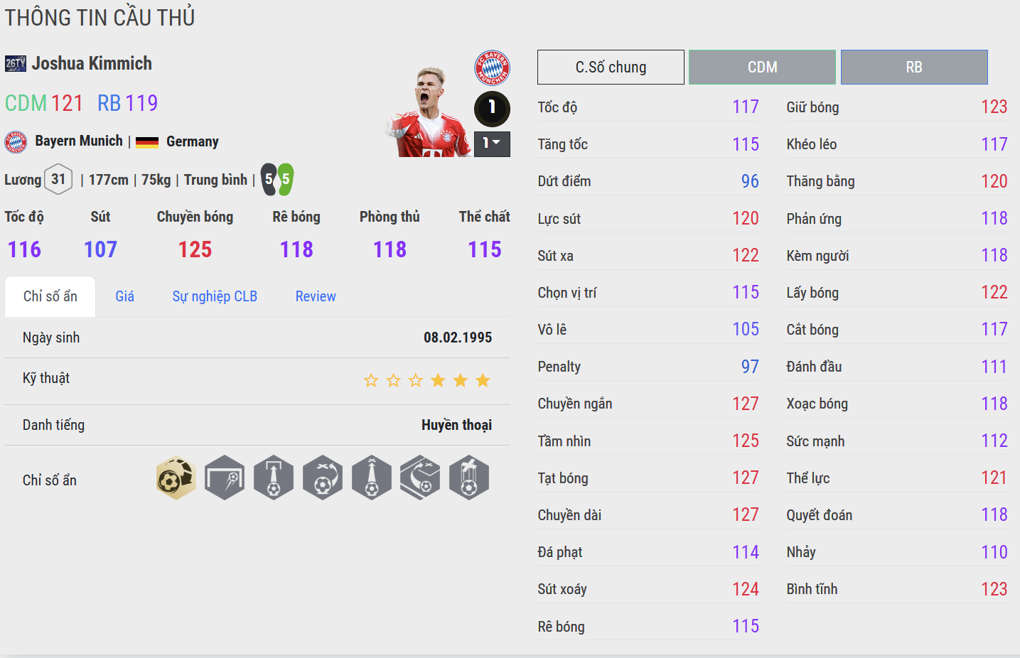 Kimmich 26TOTY là mẫu tiền vệ chiến thuật toàn diện, hội tụ giữa kỷ luật, thông minh và độ ổn định rất cao. Khả năng đọc trận đấu, thu hồi bóng và phát động tấn công từ tuyến dưới giúp anh kiểm soát hoàn toàn khu trung tuyến. Đây là phiên bản cực kỳ đáng tin cậy, phù hợp với mọi sơ đồ và lối chơi đề cao tính tổ chức.