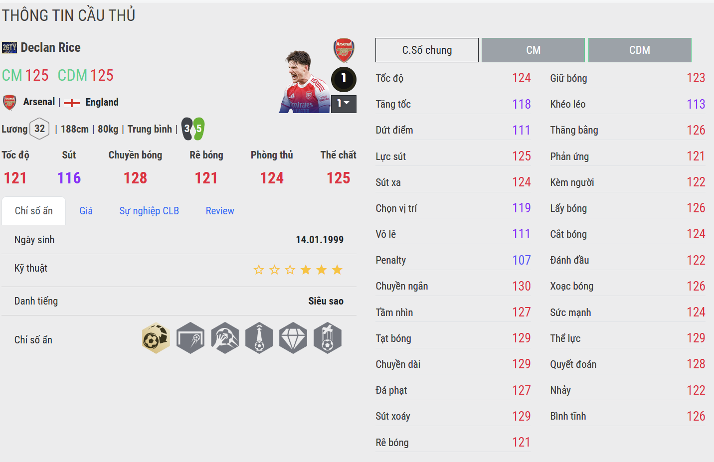 Rice 26TOTY là chuẩn mực mới cho vai trò tiền vệ trụ hiện đại trong FC Online. Thể hình, sức mạnh, khả năng cắt bóng và che chắn không gian đều đạt mức tối ưu, mang lại cảm giác chắc chắn tuyệt đối cho hàng phòng ngự. Không chỉ giỏi phòng ngự, Rice còn phân phối bóng gọn gàng và giữ nhịp lối chơi hiệu quả. Đây là phiên bản toàn diện, ổn định và có tầm ảnh hưởng lớn nhất nơi tuyến giữa – lựa chọn số một cho mọi đội hình cạnh tranh đỉnh cao.
