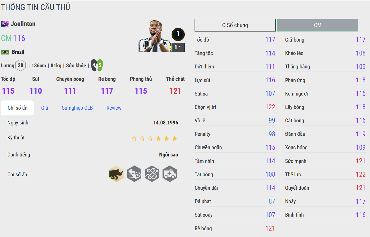 Joelinton là biểu tượng của sức mạnh và sự bền bỉ. Anh áp sát cứng rắn, tranh chấp mạnh mẽ và thường xuyên giành lợi thế trong những pha va chạm. Từng đá tiền đạo, anh có kiểm soát bóng tốt và chuyền ngắn tròn trịa, từ đó trở thành một mỏ neo đáng tin cậy nơi tuyến giữa. Một CDM mang lại cảm giác “yên tâm” mà rất nhiều đội hình cần.