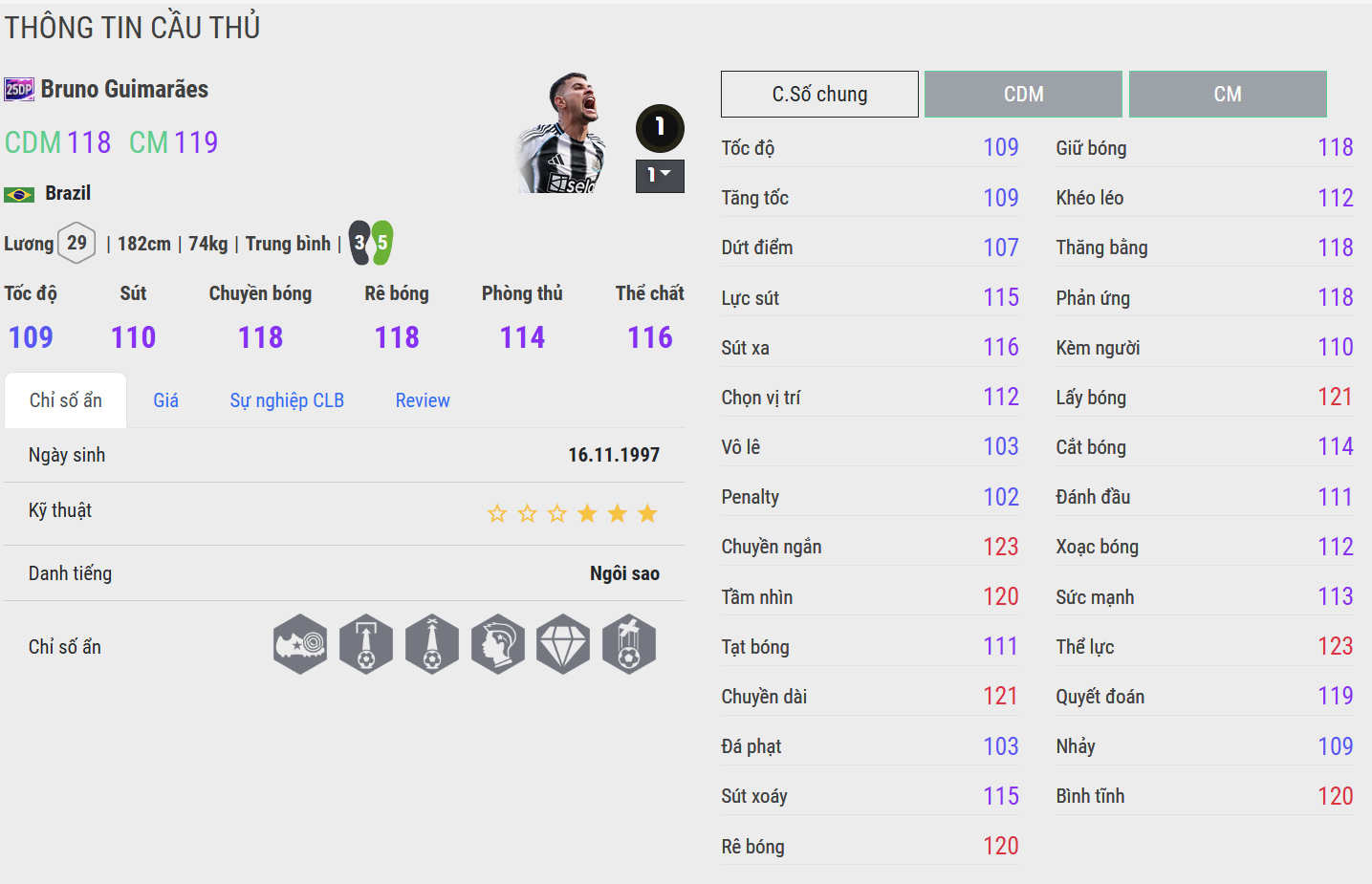 Guimarães là mẫu tiền vệ phòng ngự của bóng đá hiện đại: thông minh, chủ động và cực kỳ ổn định. Anh phòng ngự bằng sự tinh tế, luôn chọn đúng thời điểm để cắt bóng hoặc áp sát. Khả năng chuyền bóng mượt mà giúp tuyến giữa vận hành nhẹ nhàng, hạn chế tối đa những pha xử lý thừa. Một lựa chọn dành cho người chơi thích sự tinh gọn nhưng hiệu quả tuyệt đối.