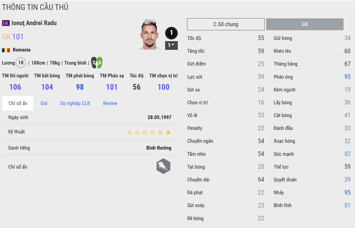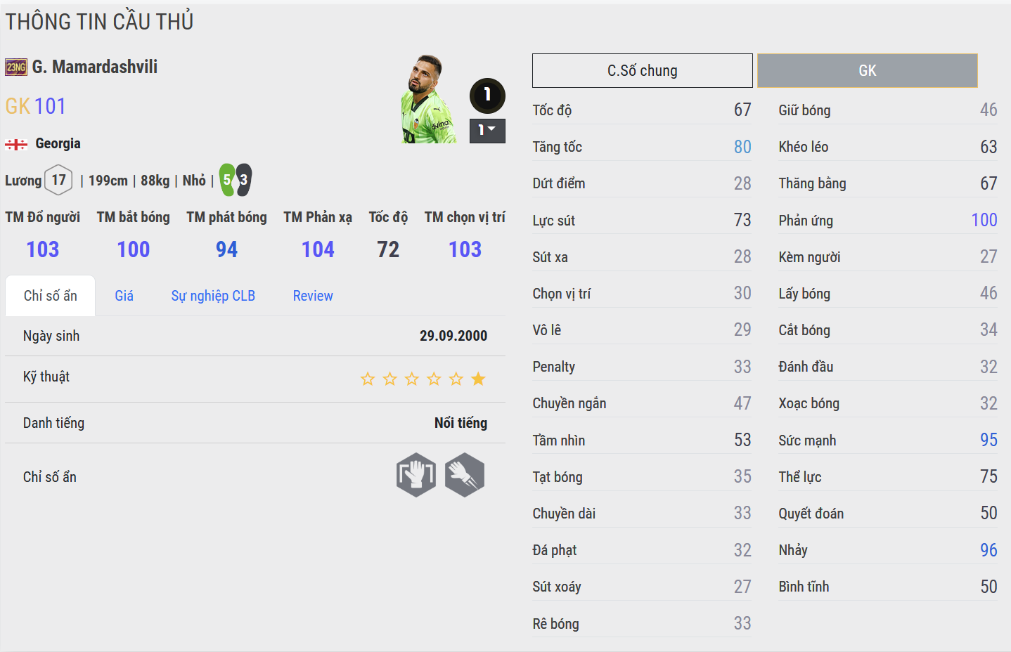 Mamardashvili 23NG là mẫu thủ môn hiện đại với thể hình cao lớn và sải tay dài. Anh bắt bóng bổng ổn định, làm chủ tốt khu vực vòng cấm và đặc biệt hiệu quả trong các pha đối mặt. Trong FC Online, Mamardashvili tạo cảm giác “che kín khung thành”, rất hợp với những đội hình thường xuyên bị bắn phá từ xa hoặc không chiến nhiều.