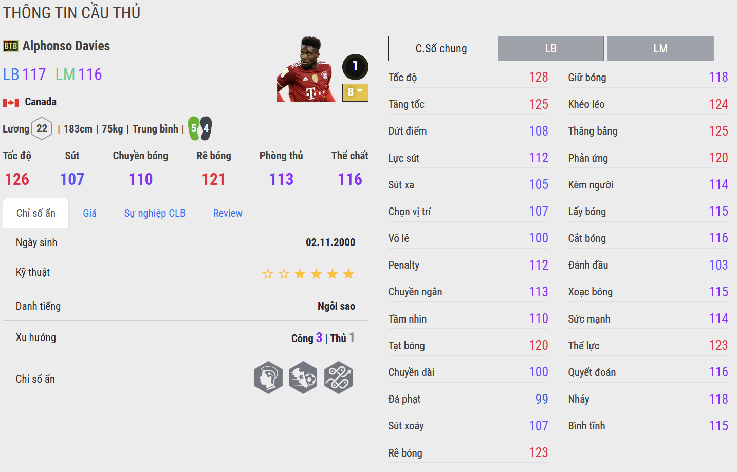 Alphonso Davies sở hữu tốc độ đáng kinh ngạc, khiến anh trở thành một mối nguy hiểm lớn trên hành lang cánh. Cầu thủ này không chỉ có khả năng phòng ngự tuyệt vời mà còn có thể dâng cao tấn công, tạo ra những pha đột phá nguy hiểm, khiến hàng thủ đối phương phải vất vả ngăn chặn.