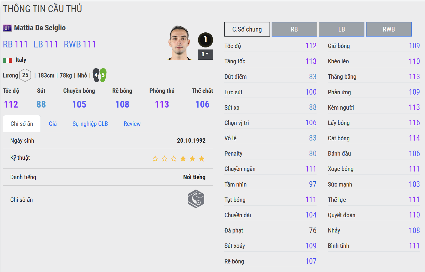 De Sciglio UT là mẫu hậu vệ phải thiên về sự an toàn và ổn định. Khả năng phòng ngự cơ bản tốt, giữ vị trí gọn gàng, ít khi dâng cao quá đà giúp anh phù hợp với những lối chơi chắc chắn, ưu tiên kiểm soát thế trận. Điểm mạnh của De Sciglio nằm ở khả năng kèm người và cắt bóng ổn định, dù đóng góp tấn công không quá nổi bật nhưng đủ dùng trong các tình huống chồng biên đơn giản.