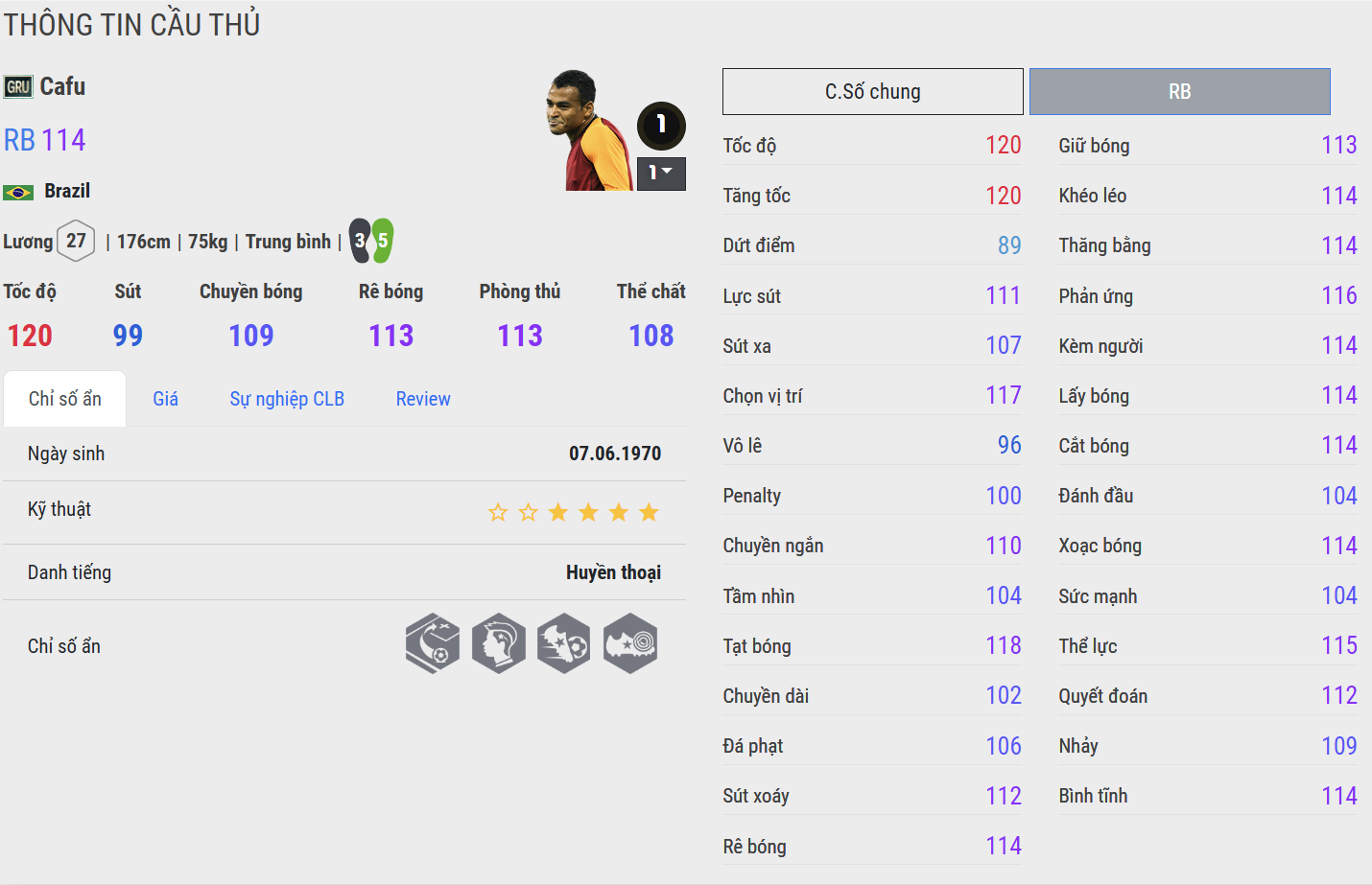 Cafu GRU gần như là hình mẫu hoàn hảo của một hậu vệ phải toàn diện. Tốc độ cao, thể lực dồi dào giúp Cafu lên công về thủ không biết mệt. Khả năng phòng ngự chắc chắn, đọc tình huống tốt kết hợp với những pha chồng biên liên tục tạo áp lực lớn bên hành lang phải. Đây là RB cực kỳ phù hợp với lối chơi tấn công biên mạnh và cường độ cao.