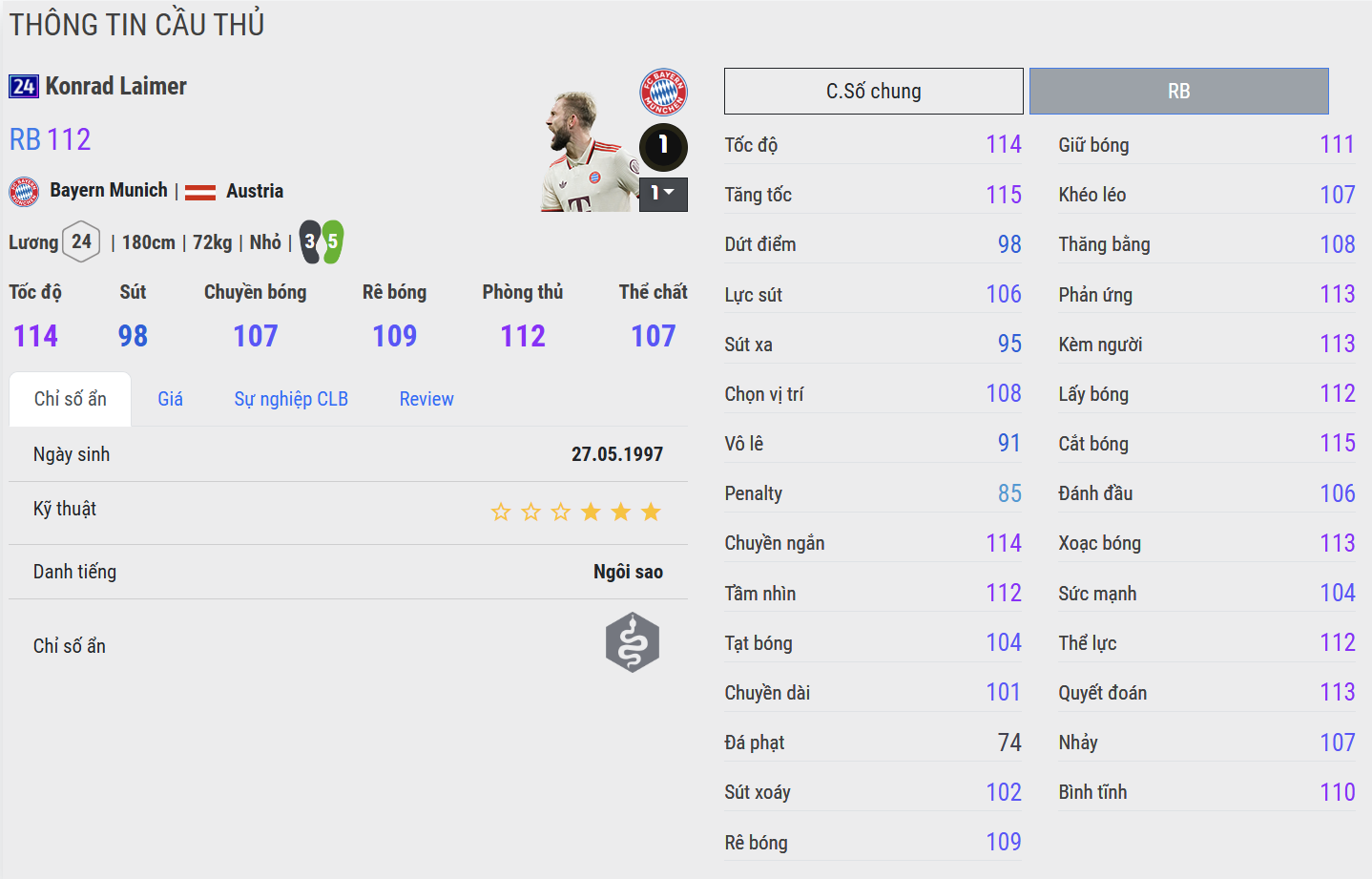 Laimer 24UCL là lựa chọn RB mang thiên hướng chiến thuật rất rõ ràng. Khả năng pressing, tranh chấp và bọc lót cực tốt giúp hành lang phải luôn được đảm bảo an toàn. Không quá hoa mỹ khi tấn công, nhưng Laimer bù lại bằng sự cơ động, thông minh trong di chuyển và khả năng giữ nhịp đội hình. Một RB cực kỳ “khó chịu”, đặc biệt hiệu quả trong các lối chơi kiểm soát và phòng ngự phản công hiện đại.