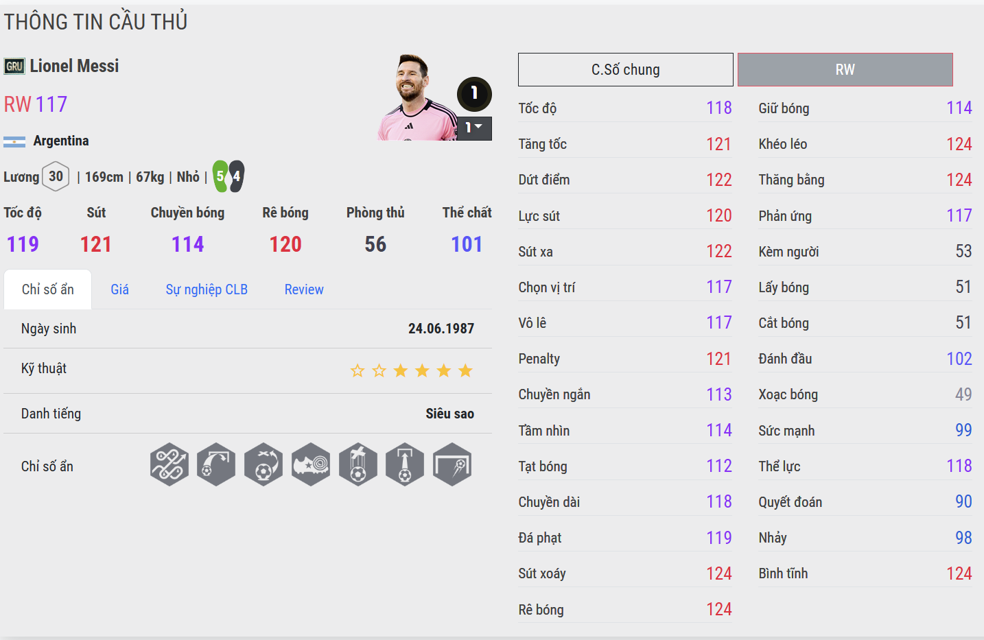 Messi GRU ở vị trí RW mang đến sự tinh tế và tính sáng tạo hơn là tốc độ thuần túy. Phiên bản này nổi bật ở khả năng giữ bóng, rê dắt trong không gian hẹp và những pha xử lý một chạm cực kỳ mượt mà. Dù không phải mẫu RW bám biên truyền thống, Messi GRU rất nguy hiểm khi bó vào trung lộ, kết nối với tuyến giữa và tung ra những cú dứt điểm hoặc chọc khe mang tính sát thương cao.