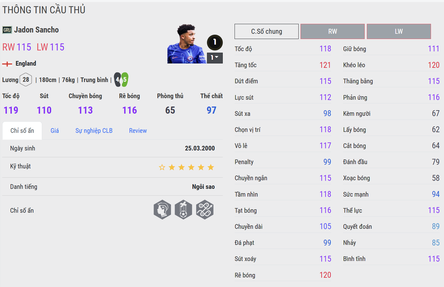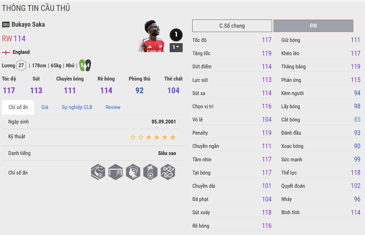 Saka GRU là phiên bản RW toàn diện bậc nhất trong danh sách. Anh sở hữu tốc độ tốt, khả năng rê bóng ổn định, chuyền – tạt hiệu quả và đặc biệt là tư duy chơi bóng rất thông minh. Saka không chỉ leo biên hay cắt vào trong, mà còn biết chọn thời điểm giữ nhịp, phối hợp và đưa ra quyết định hợp lý. Phiên bản GRU mang lại cảm giác dễ dùng, ổn định và phù hợp với nhiều hệ thống chiến thuật – mẫu RW có thể xoay quanh để xây dựng cả cánh phải.