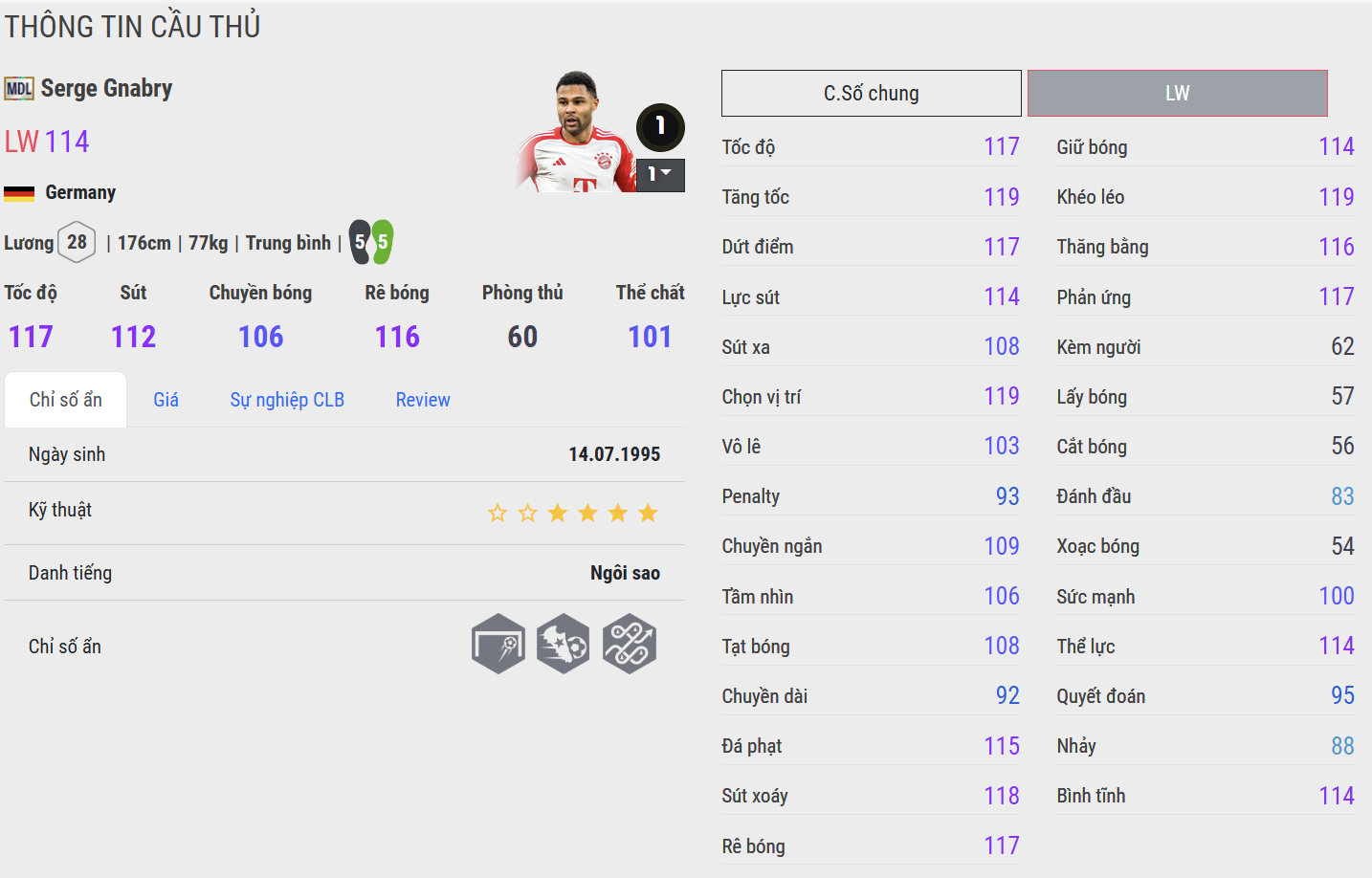 Gnabry MDL mang đến hình ảnh RW giàu tốc độ, trực diện và đầy sức sát thương. Anh bứt tốc tốt, xâm nhập vòng cấm mạnh mẽ và dứt điểm khá “sát”. Khác với những RW thiên về làm bóng, Gnabry MDL nguy hiểm nhất ở các pha chạy chỗ sau lưng hậu vệ và kết liễu nhanh gọn, rất phù hợp với lối chơi phản công hoặc tấn công tốc độ cao.