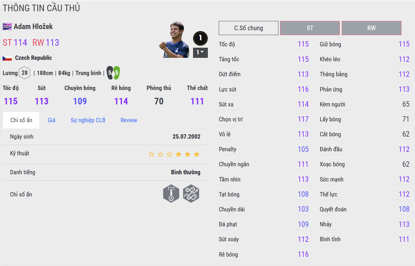 Hlozek là trung phong mạnh mẽ, trực diện và tràn đầy năng lượng. Anh sở hữu tốc độ tốt, khả năng tì đè ấn tượng và dứt điểm một chạm quyết đoán. Trong gameplay, Hlozek mang lại cảm giác “nhiệt” – luôn áp sát, pressing không ngừng và sẵn sàng tạo đột biến bằng sức trẻ. Phù hợp với đội bóng ưa lối chơi nhanh, dồn dập và giàu thể lực.