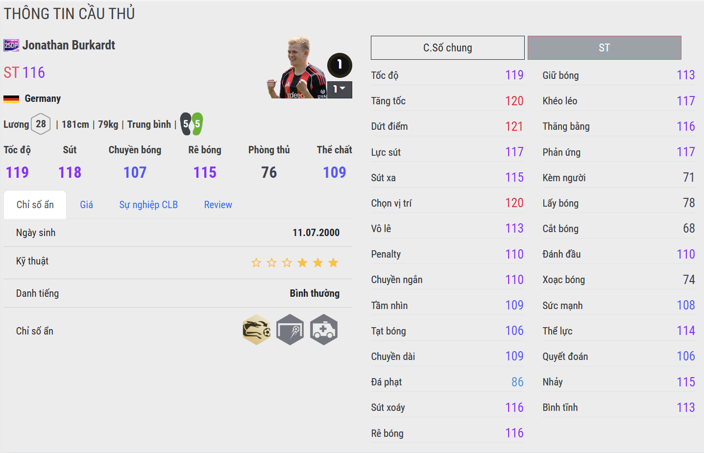 Burkardt là hình mẫu của sự ổn định và cần cù. Anh di chuyển khôn ngoan, chọn vị trí tinh tế và luôn xuất hiện đúng lúc trong vòng cấm. Dù thể hình không quá lý tưởng, Burkardt bù đắp bằng khả năng xử lý bóng gọn gàng và dứt điểm chính xác. Trong gameplay, anh là tiền đạo đáng tin cậy – không hoa mỹ, nhưng cực kỳ hiệu quả trong phối hợp nhỏ hoặc phản công nhanh.