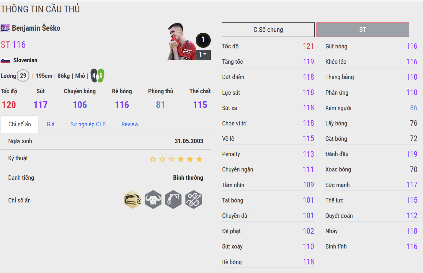 Šeško là mẫu trung phong hiện đại: cao lớn, nhanh nhẹn và dứt điểm cực gọn. Anh biết tận dụng thể hình để che chắn, phối hợp hiệu quả trong không gian hẹp và đặc biệt nguy hiểm khi xâm nhập vòng cấm. Trong gameplay, Šeško vừa có thể làm tường, vừa tự mình ghi bàn, phù hợp với lối chơi tấn công trực diện hoặc kiểm soát nhịp độ.