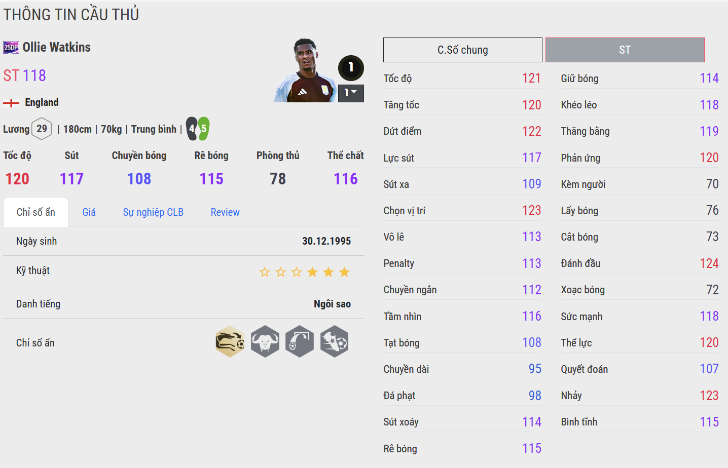 Watkins là biểu tượng của sự bền bỉ và khát khao. Anh sở hữu tốc độ, kỹ thuật và cảm giác vị trí tuyệt vời, cùng khả năng dứt điểm ổn định bằng cả hai chân. Trong gameplay, Watkins thể hiện AI di chuyển thông minh – thường xuyên thoát xuống đúng lúc và tận dụng cơ hội cực tốt. Một tiền đạo “chuẩn Devoted”: không hoa mỹ, không ồn ào, nhưng luôn tạo ra khác biệt trong những thời khắc quan trọng.
