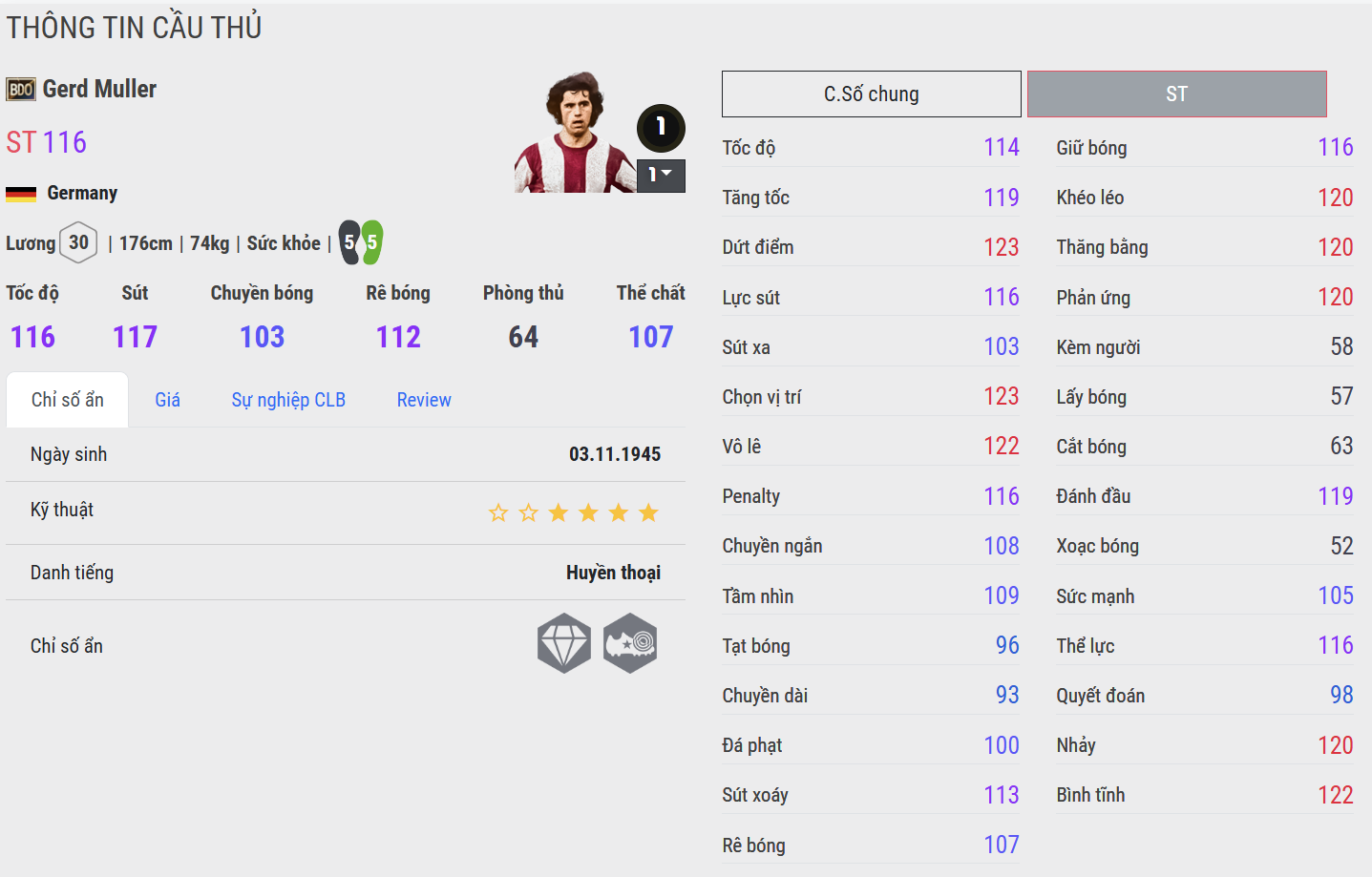Gerd Muller BDO là hiện thân của bản năng săn bàn thuần khiết. Khả năng chọn vị trí xuất sắc, xử lý cực gọn trong phạm vi hẹp và dứt điểm một chạm lạnh lùng giúp ông luôn xuất hiện đúng lúc ở những điểm nóng trong vòng cấm. Đây là mẫu tiền đạo không cần nhiều khoảng trống, nhưng mỗi pha chạm bóng đều mang theo cảm giác bàn thắng rõ rệt.