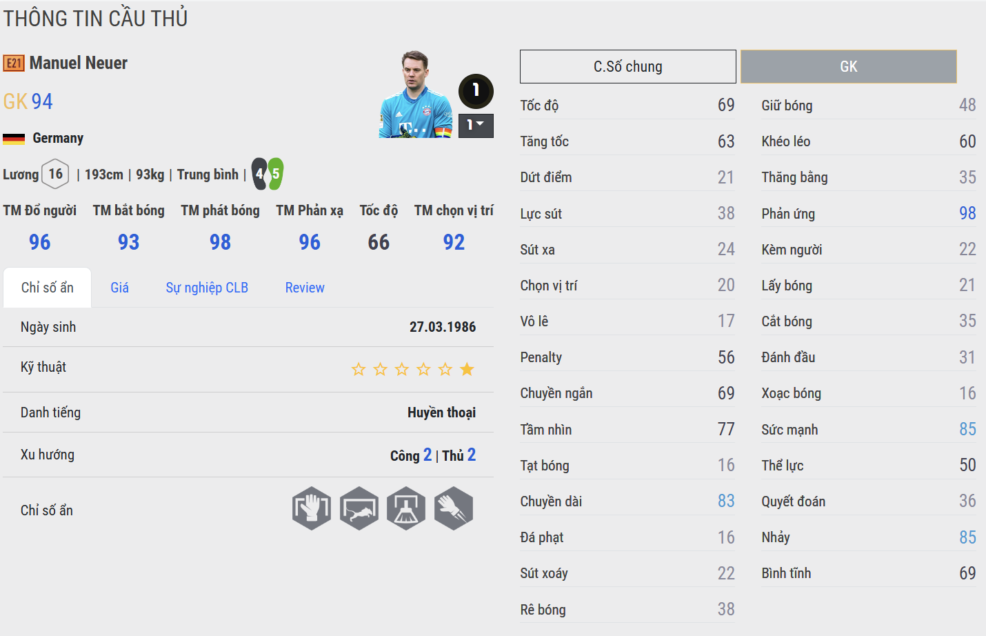 Khả năng đọc tình huống tuyệt vời, chơi chân tốt. Neuer luôn là biểu tượng cho mẫu thủ môn hiện đại, và mùa BOE21 không ngoại lệ. Với chỉ số chơi chân cao, ra vào hợp lý và khả năng phản xạ đáng tin cậy, Neuer có thể hóa giải nhiều tình huống nguy hiểm từ sớm. Dù tốc độ không còn cao như các mùa trước, nhưng độ ổn định vẫn là lý do khiến anh được ưa chuộng.