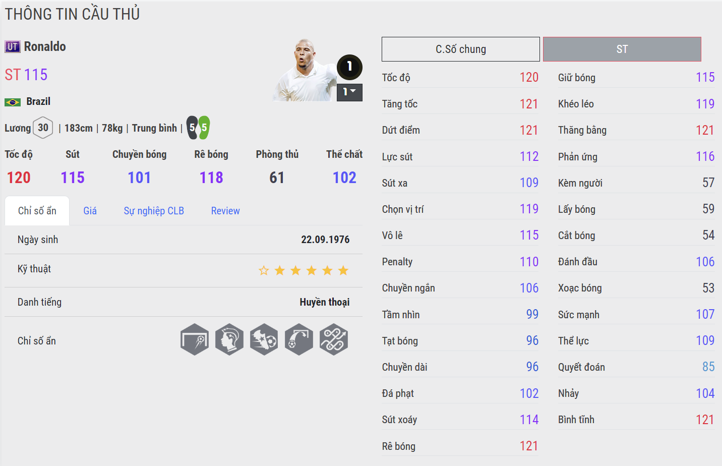 Rô béo có một phiên bản cực kì nổi bật khi có bộ chỉ số tổng còn cao hơn với mùa ICON. Dù mức lương cao nhưng rõ ràng Ronaldo de Lima đang đem đến nhiều hiệu quả từ tốc độ tốt, kỹ năng rê bóng hiệu quả, khả năng sút tốt bằng cả 2 chân cùng với AI di chuyển cực kì nhạy bén khiến cho Ronaldo là cái tên sáng giá bậc nhất cho vai trò tiền đạo cắm.