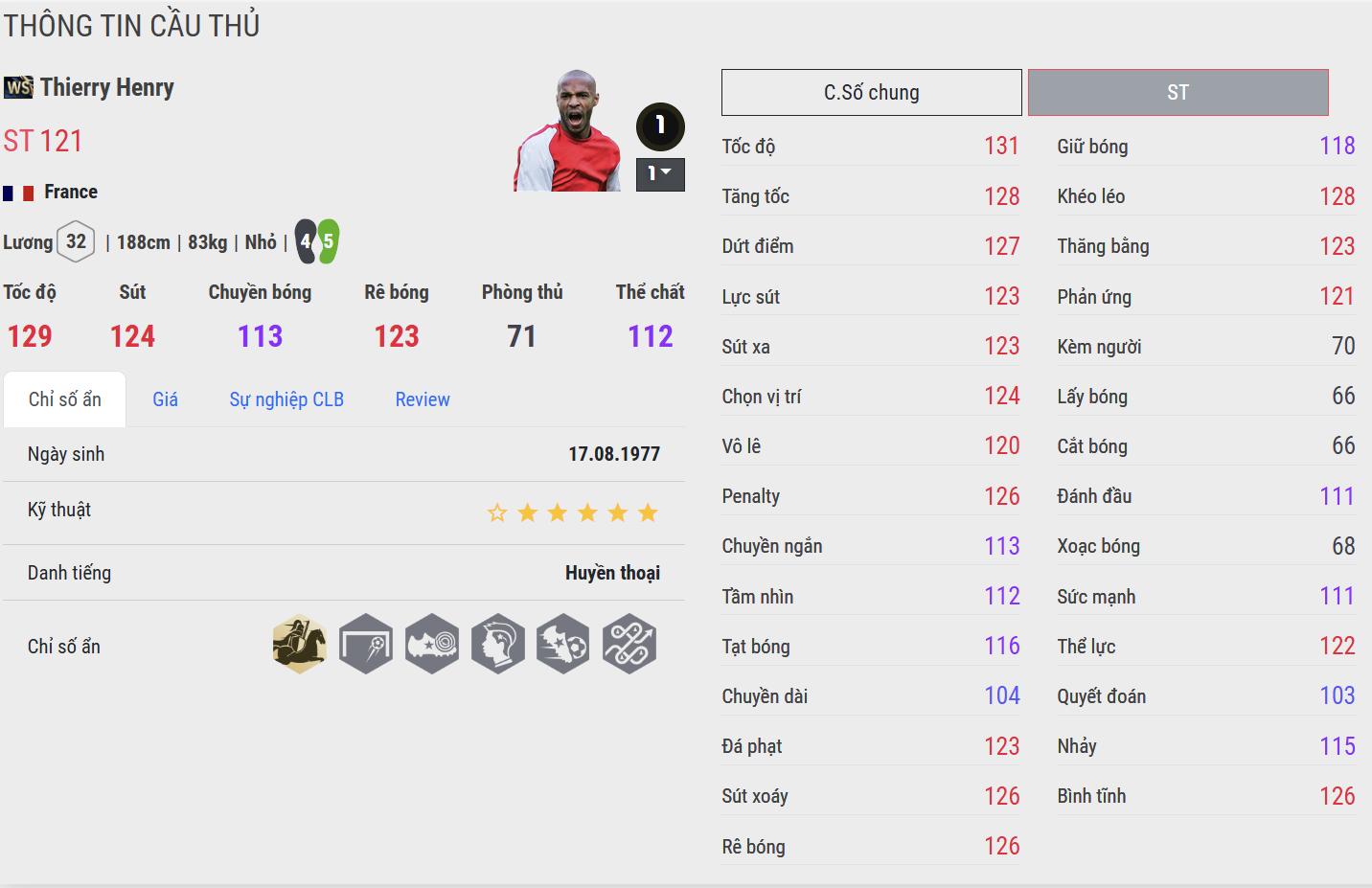 Huyền thoại Arsenal mang đến tốc độ xé gió cùng những pha dứt điểm lạnh lùng. Henry WS là mẫu tiền đạo giàu đột biến, sẵn sàng tự mình xoay chuyển cục diện chỉ bằng một khoảnh khắc.