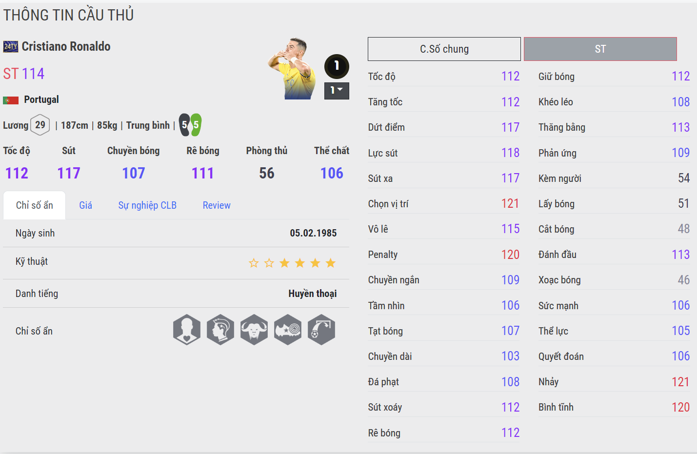 Được đánh giá là mẫu tiền đạo toàn diện nhất game. Không cần nói quá nhiều để hiểu hơn lối chơi cũng như sự hiệu quả của CR7 trong FC Online. Tốc độ tốt, kỹ thuật dẻo, khả năng không chiến đỉnh cao cùng bộ kỹ năng dứt điểm toàn diện chính là những yếu tố tạo nên một Cristiano Ronaldo cực kì bá. Hiệu suất ghi bàn tăng cao rõ rệt và sẽ khiến nhiều hàng phòng ngự quốc dân phải khốn đốn.