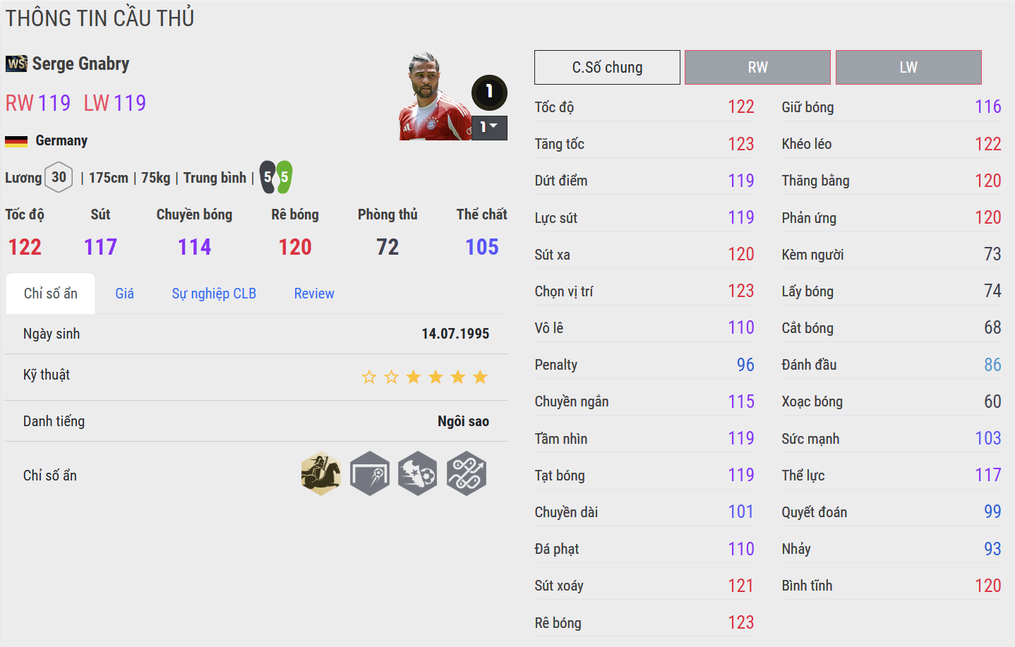 Gnabry WS là mẫu tiền vệ cánh hiện đại: nhanh, mạnh và giàu tính đột biến. Anh nổi bật với khả năng bứt tốc, rê bóng khéo và dứt điểm uy lực ở cự ly trung bình. Trong gameplay, Gnabry đặc biệt hiệu quả khi bó vào trung lộ như một “inside forward”, sẵn sàng tung cú sút hiểm hóc vào góc xa – một vũ khí lợi hại cho các đội hình tấn công biên linh hoạt.