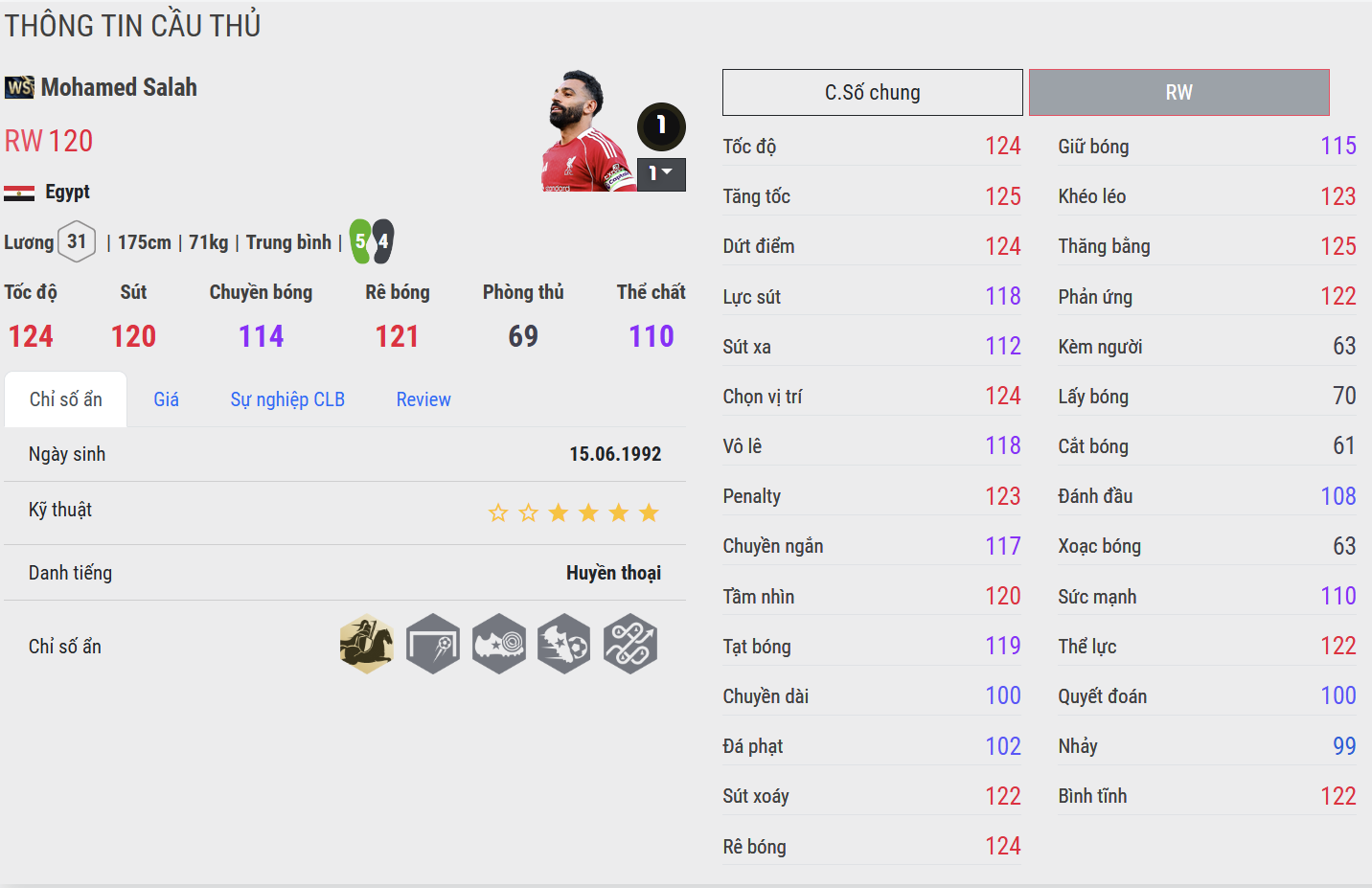 Salah WS là “vũ khí tấn công hạng nặng” nơi hành lang phải. Với tốc độ xé gió, những pha rê bóng dính chân và dứt điểm cực nhanh bằng chân trái, anh luôn là mối nguy thường trực với bất kỳ hàng phòng ngự nào. Không chỉ biết ghi bàn, Salah còn rất biết phối hợp, phù hợp cho cả lối chơi phản công lẫn kiểm soát bóng. Một RW toàn diện và đáng tin cậy trong mọi hệ thống.