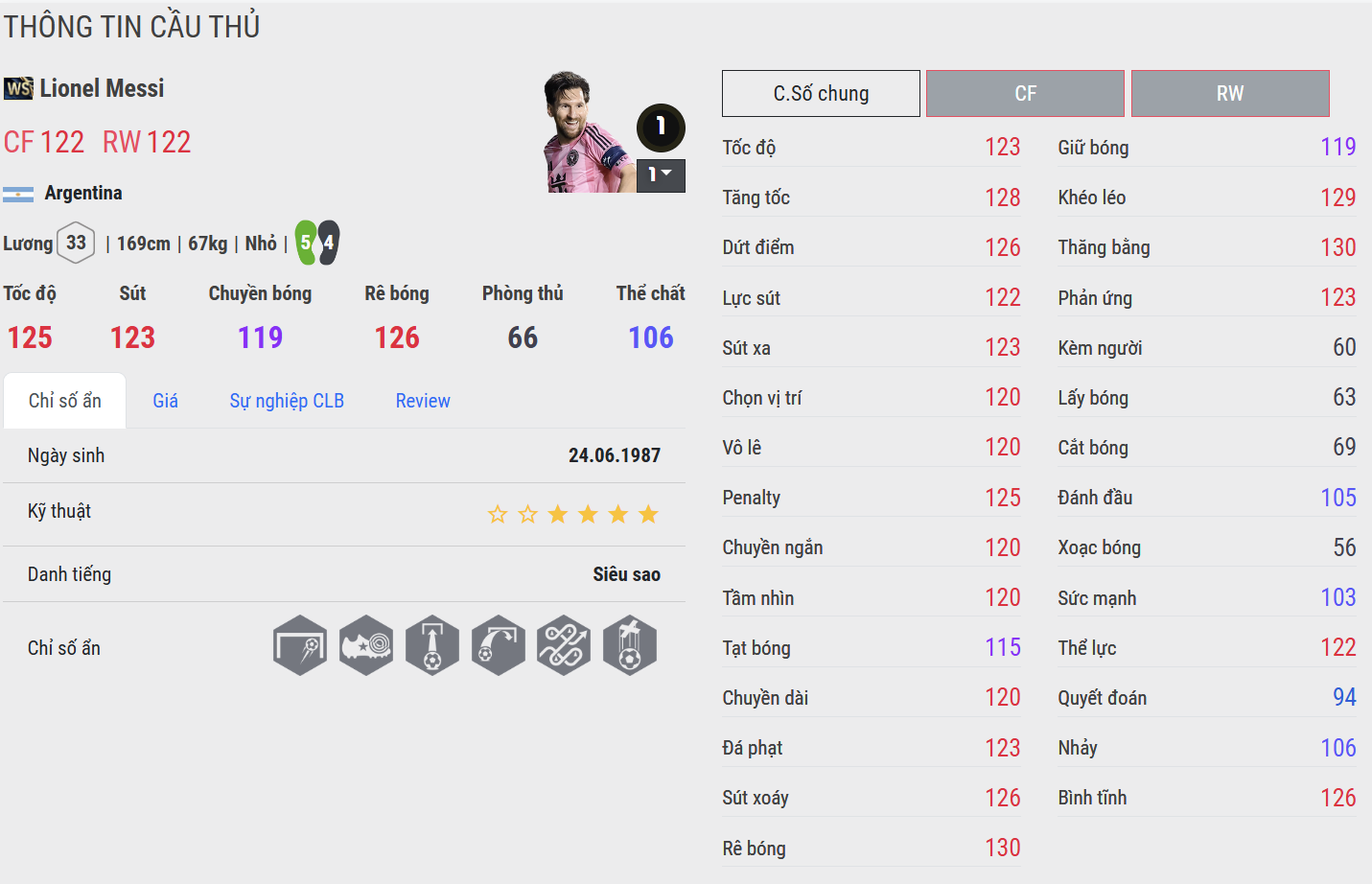 Messi WS là biểu tượng của sáng tạo và tinh tế. Anh không cần tốc độ thuần túy để tạo khác biệt, mà dùng trí tuệ và kỹ thuật siêu hạng để “mở khóa” mọi hàng phòng ngự. Những pha rê bóng mềm mại, đường chuyền xuyên tuyến chuẩn xác và cú cứa lòng vào góc chết là thương hiệu của anh. Một CAM kiêm RW hoàn hảo – nơi giao thoa giữa nghệ thuật và hiệu quả, xứng đáng ngự trị ở vị trí số một.
