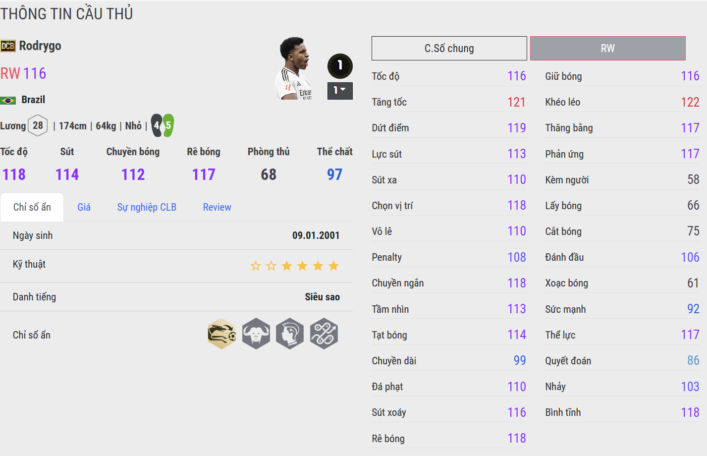 Rodrygo DCB mang đến sự trẻ trung và đột biến. Anh nhanh nhẹn, rê bóng mượt mà và dứt điểm đa dạng trong vòng cấm. Trong gameplay, Rodrygo đặc biệt hiệu quả ở các pha xâm nhập từ cánh phải vào trung lộ, tận dụng AI di chuyển thông minh và khả năng chọn vị trí sắc bén để tạo khác biệt.