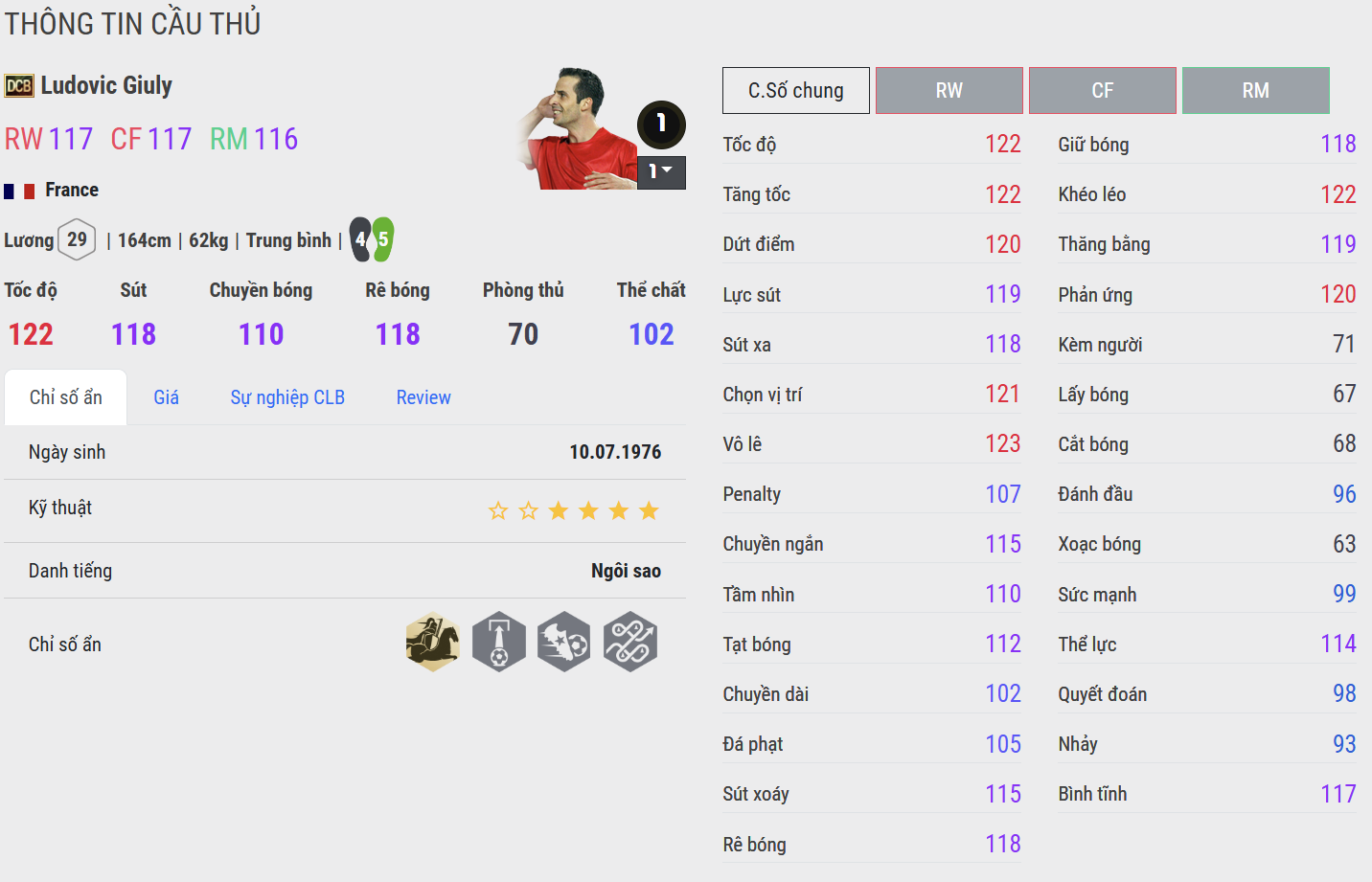 Giuly DCB là mẫu RM nhỏ con nhưng tinh quái. Anh sở hữu tốc độ bứt phá nhanh, khả năng rê bóng dính chân và lối chơi lắt léo đầy khó lường. Trong gameplay, Giuly luôn mang đến cảm giác bất ngờ, có thể đột nhập vòng cấm và tung ra những cú dứt điểm chớp nhoáng, đúng chất “kẻ quấy rối” nơi biên phải.