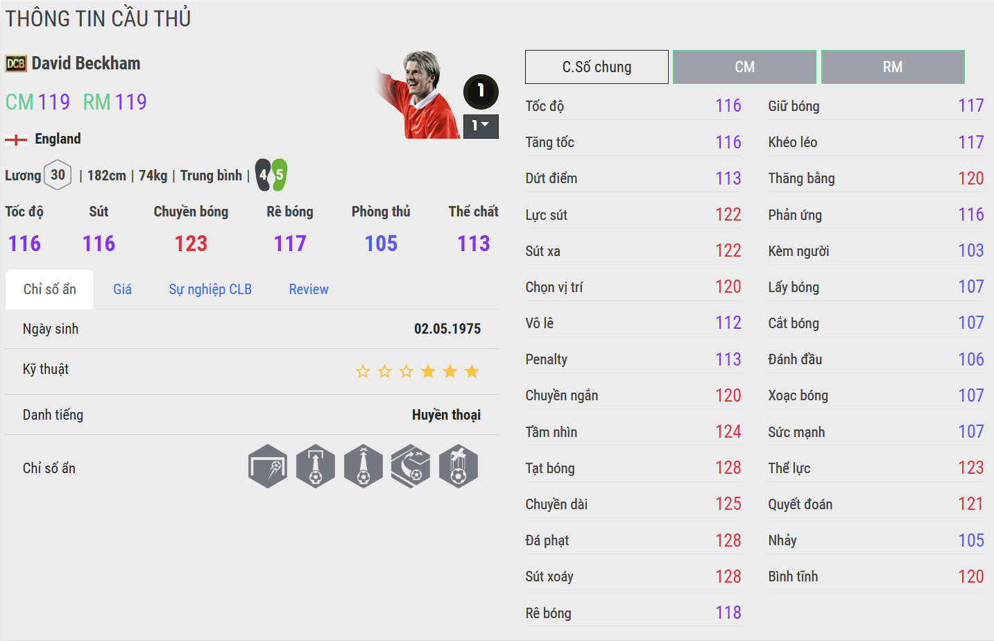 Beckham DCB là cái tên đẳng cấp nhất ở vị trí RM. Anh sở hữu những quả tạt bóng “chuẩn từng centimet”, khả năng chuyền dài siêu hạng và những cú sút xa uy lực. Trong gameplay, Beckham đặc biệt lợi hại ở các tình huống tạt cánh, sút phạt trực tiếp và dứt điểm từ xa. Đây chính là mẫu RM toàn diện, vừa kiến tạo, vừa biết cách định đoạt trận đấu bằng khoảnh khắc khác biệt.