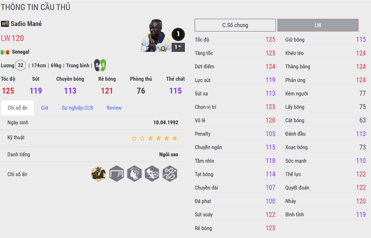 Mané WS tái hiện hình ảnh một mũi khoan cánh đầy sát thương: nhanh, mạnh và luôn trực diện. Anh mang đến sự bùng nổ trong từng pha xâm nhập, cùng khả năng tạo đột biến bằng cả tốc độ lẫn kỹ năng dứt điểm. Điểm nổi bật của Mané WS là khả năng di chuyển không bóng và pressing cực sung – phù hợp với meta pressing cao hoặc lối đá cường độ mạnh. Một cầu thủ dành cho những HLV ưa thích áp lực và tốc độ đến nghẹt thở.