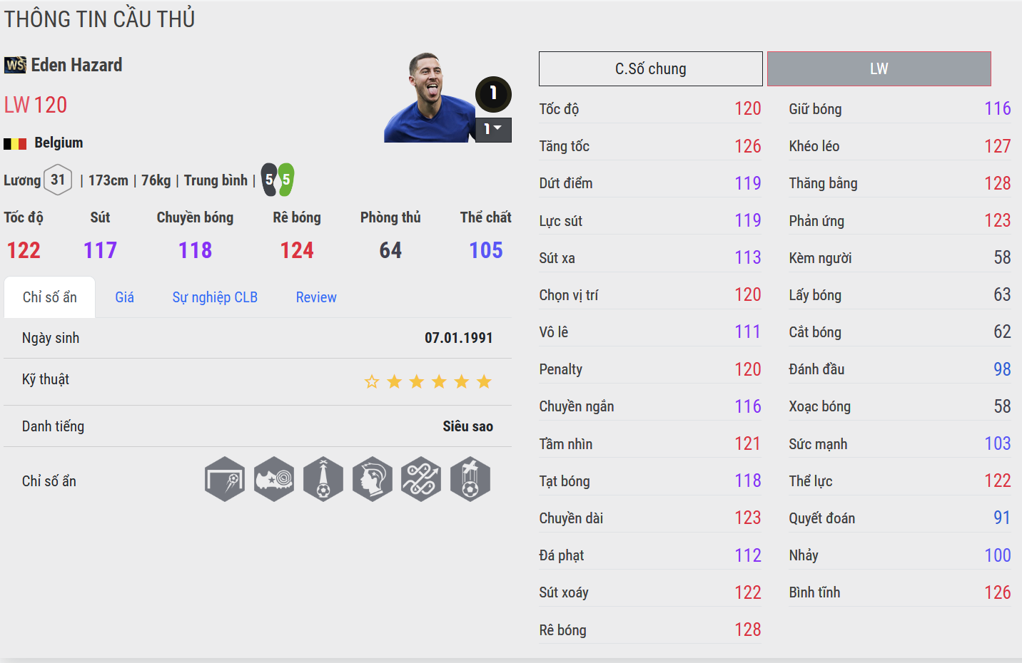 Ở thời kỳ đỉnh cao, ít ai có thể ngăn cản được Hazard WS. Cảm giác bóng mềm mại, khả năng giữ thăng bằng tuyệt vời và kỹ năng rê dắt lắt léo giúp anh trở thành “ngòi nổ” cực kỳ khó đoán. Trong FC Online, Hazard WS là lựa chọn hoàn hảo cho người thích lối chơi kỹ thuật – anh rê dắt mượt, bẻ hướng nhanh, dứt điểm tinh tế và đặc biệt nguy hiểm khi bó vào trong. Một cầu thủ chơi bóng bằng cảm hứng, mang đến thứ ma thuật hiếm thấy trên sân ảo.
