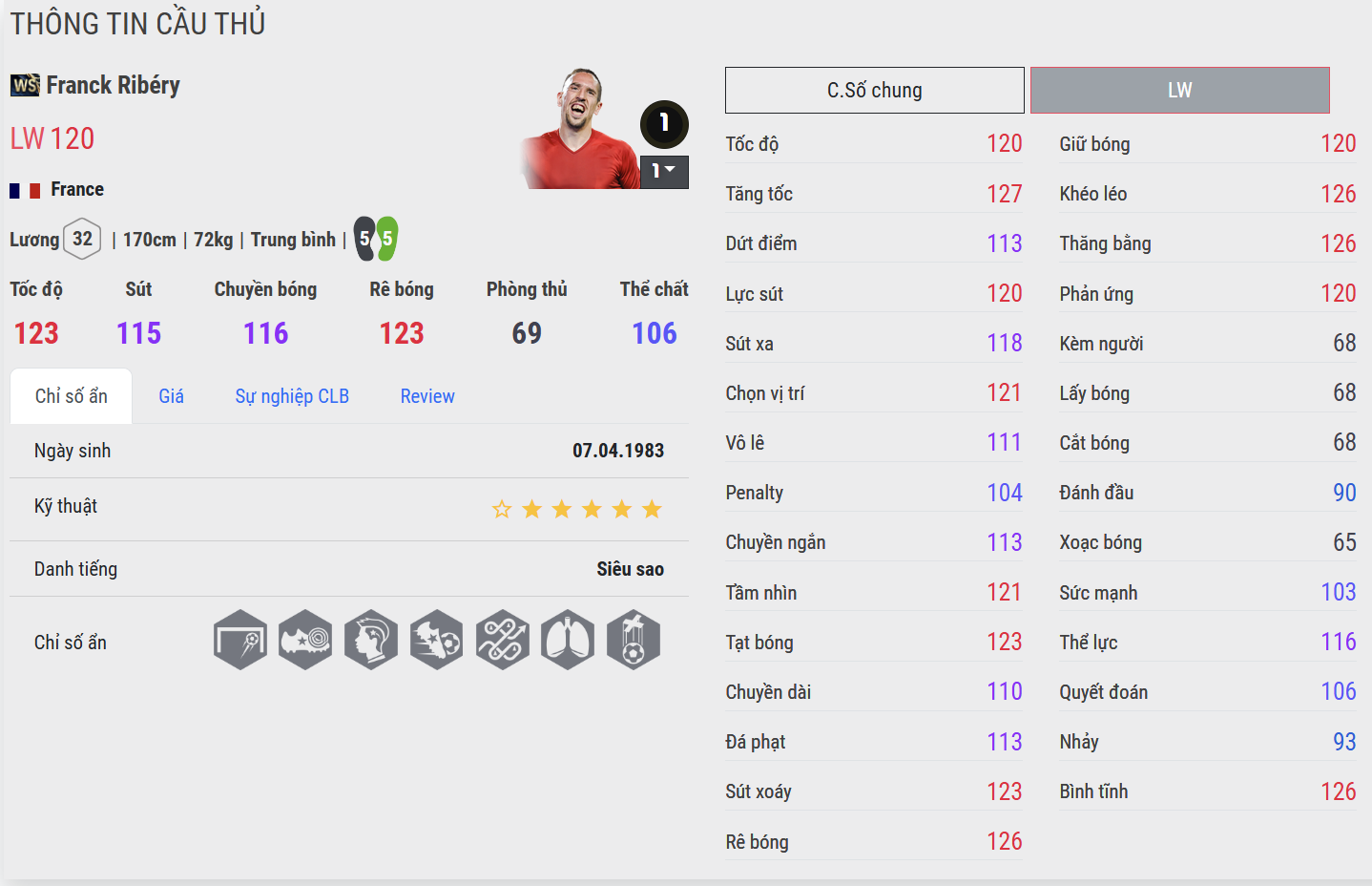 Đứng đầu danh sách là Ribéry WS – biểu tượng của nghệ thuật bóng đá nơi hành lang trái. Anh kết hợp hoàn hảo giữa tốc độ, kỹ thuật và óc sáng tạo, có thể vừa kiến tạo vừa tự mình kết liễu trận đấu. Điểm mạnh lớn nhất của Ribéry WS nằm ở khả năng giữ bóng khéo léo và xử lý trong không gian hẹp, khiến mọi hậu vệ phải khổ sở trong các tình huống một đối một. Mỗi pha đi bóng của anh là một màn trình diễn mang đậm dấu ấn nghệ sĩ – nhanh, táo bạo và đầy tinh tế.
