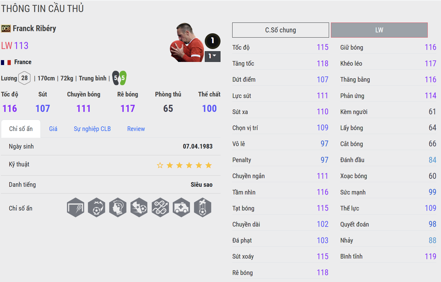 Ribery DCB là hình mẫu tiêu biểu của sự lắt léo và giàu đột biến. Anh sở hữu kỹ năng rê bóng mềm mại, bứt tốc ngắn cực nhanh và khả năng tạo khoảng trống đầy tinh quái. Trong gameplay, Ribery đặc biệt nguy hiểm khi bó vào trung lộ để sút hoặc phối hợp, trở thành mũi khoan sắc bén bên hành lang trái.