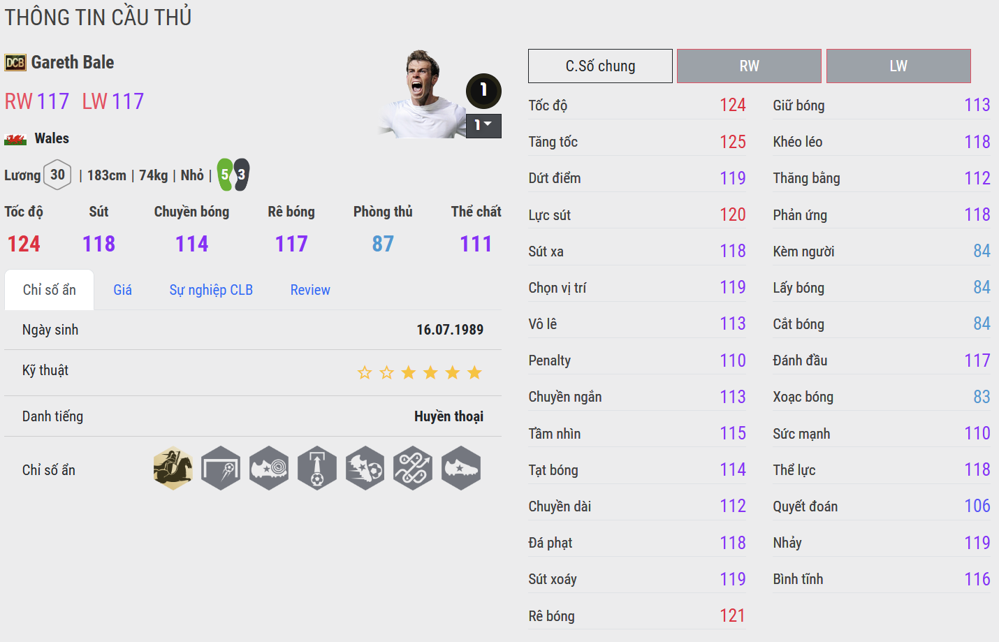 Bale DCB là sự pha trộn hoàn hảo giữa tốc độ đường dài và khả năng dứt điểm uy lực. Anh sở hữu cú sút xa sấm sét, thể hình lý tưởng cùng sức mạnh tì đè vượt trội. Trong gameplay, Bale vừa có thể làm bóng, vừa trực tiếp định đoạt trận đấu bằng những pha bứt tốc thẳng vào khung thành và những cú nã đại bác đầy uy lực.