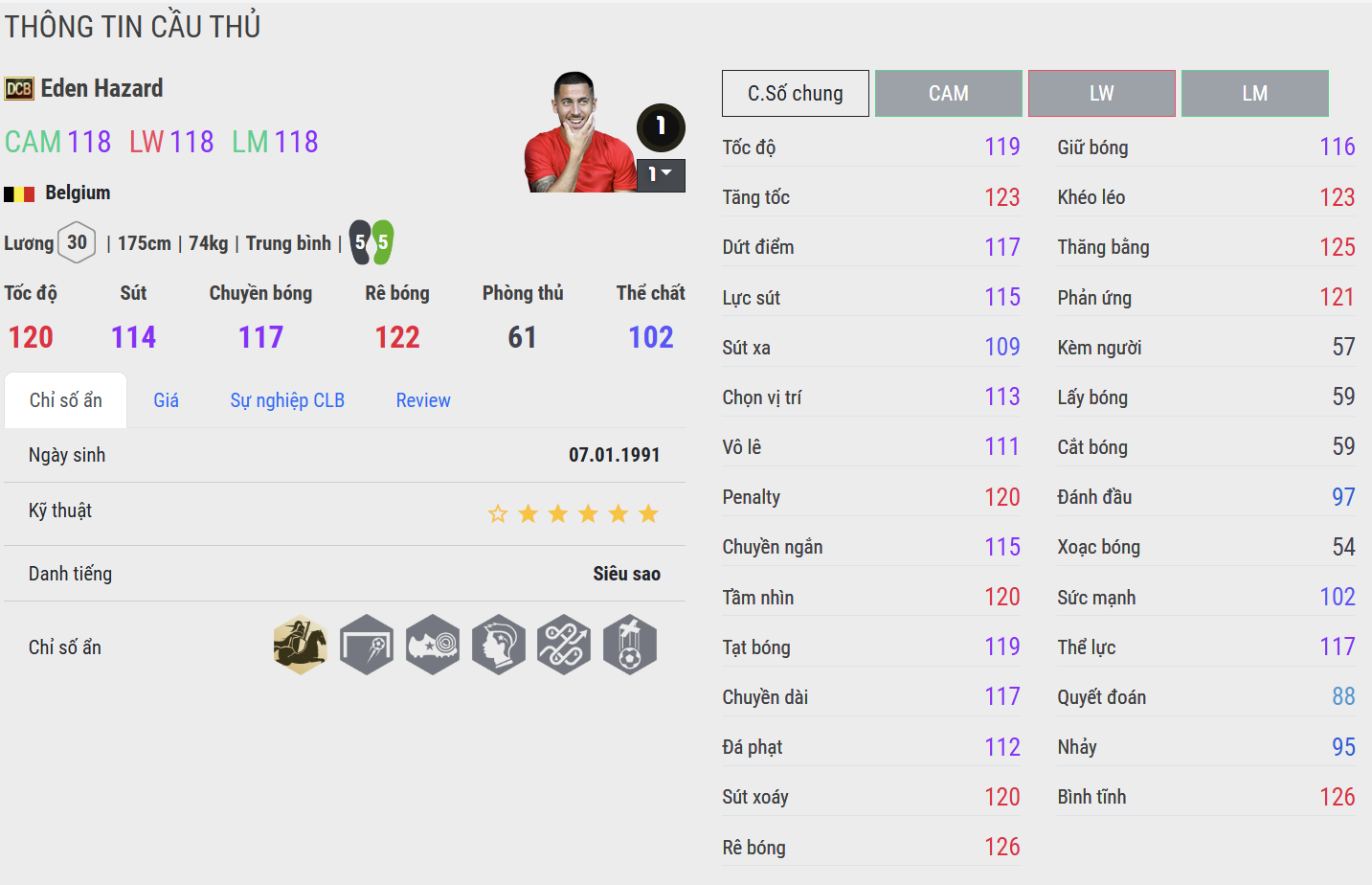 Hazard DCB chính là LM toàn diện và đẳng cấp nhất mùa thẻ này. Anh nổi bật với kỹ thuật thượng thừa, khả năng rê bóng mềm mại, bứt tốc linh hoạt và những cú dứt điểm tinh tế. Trong gameplay, Hazard vừa có thể đóng vai trò kiến tạo, vừa trực tiếp ghi bàn, mang lại cảm giác bùng nổ trong mọi tình huống. Đây là lá bài tấn công lợi hại bậc nhất bên cánh trái mùa DCB.