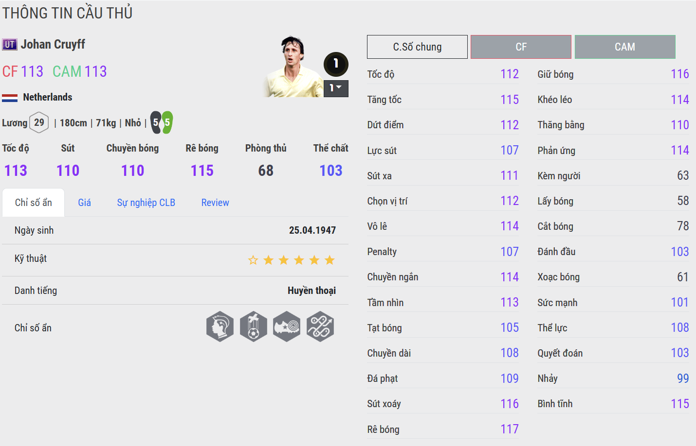 Cruyff UT mang trọn tinh thần “Total Football” với lối chơi sáng tạo và đầy ngẫu hứng. Anh rê bóng cực mượt, xử lý thanh thoát và thường xuyên tạo ra đột biến bằng những pha xoay người hoặc tăng tốc bất ngờ. Đặc biệt, những cú ZD cong vút thương hiệu giúp Cruyff trở thành hung thần trước vòng cấm. Đây là CAM dành cho HLV thích sự nghệ sĩ nhưng vẫn đầy hiệu quả.