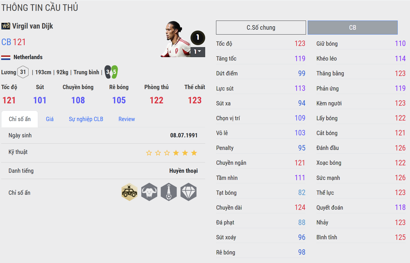 Van Dijk WS đơn giản là biểu tượng của sự hoàn hảo ở vị trí trung vệ. Với chiều cao, sức mạnh và khả năng phán đoán siêu việt, anh gần như không có điểm yếu trong các pha không chiến hay đối đầu trực diện. Điểm nổi bật của Van Dijk WS nằm ở sự điềm tĩnh và khả năng điều tiết nhịp độ từ hàng thủ – luôn biết khi nào nên dâng cao, khi nào cần lùi sâu. Anh là “lá chắn thép” toàn diện, phù hợp với mọi phong cách phòng ngự trong FC Online.